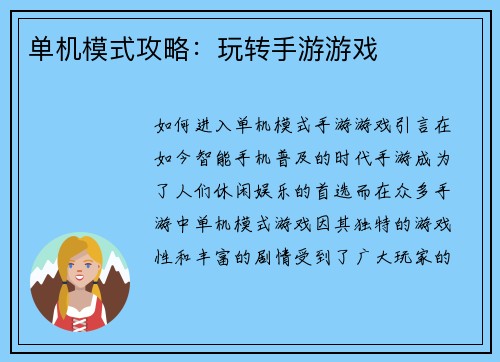 如何进入单机模式手游游戏 引言 在如今智能手机普及的时代,手游成为了人们休闲娱乐的首选。而在众多手游中,单机模式游戏因其独特的游戏性和丰富的剧情受到了广大玩家的喜爱。本文将详细介绍如何进入单机模式手游...